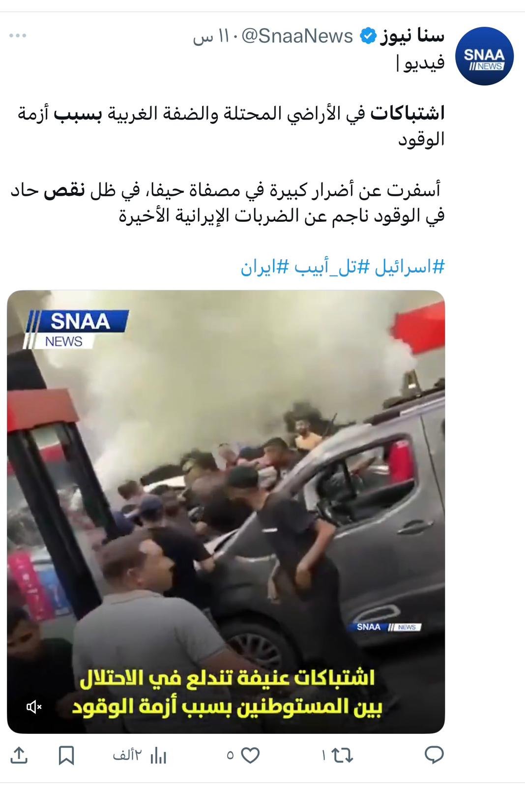تداولت صفحات إخبارية وحسابات على مواقع التواصل الاجتماعي مقطع فيديو قالوا إنه لاشتباكات بين مستوطنين بسبب نقص الوقود، في ظل أزمة حادة ناجمة عن الضربات الإيرانية التي تسببت بأضرار في مصفاة حيفا.