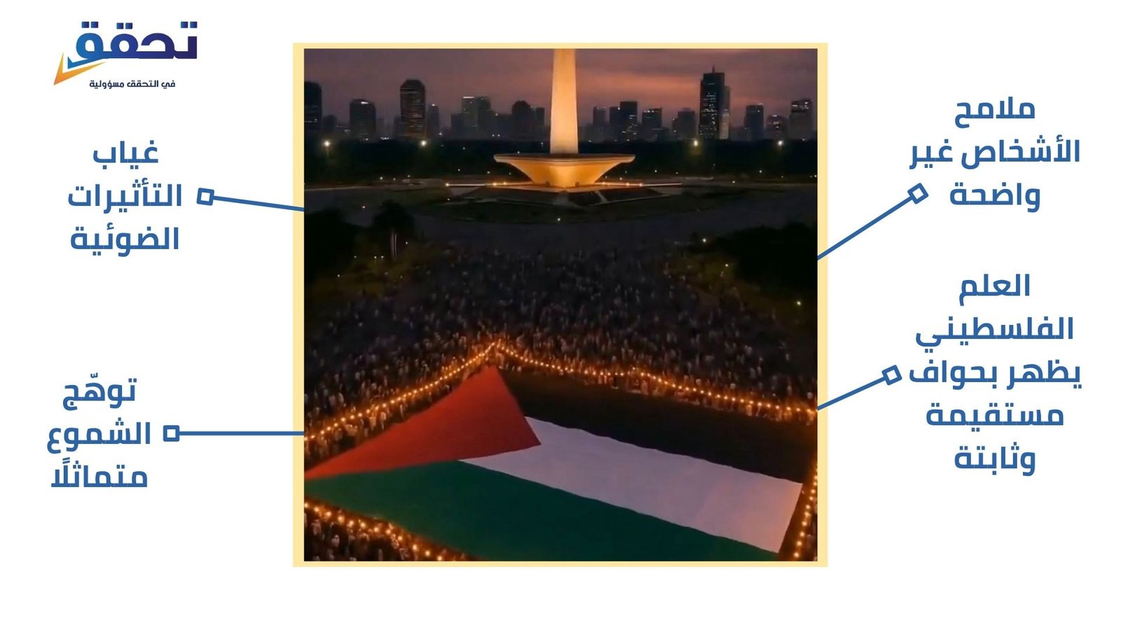 ثالثاً : تبرز أضواء النُصُب الوطني وخلفية المدينة بوضوح وتفاصيل زائدة، بينما تغيب التأثيرات الضوئية المتوقعة في مقدمة المشهد، كانعكاسات الشموع أو الحشود.