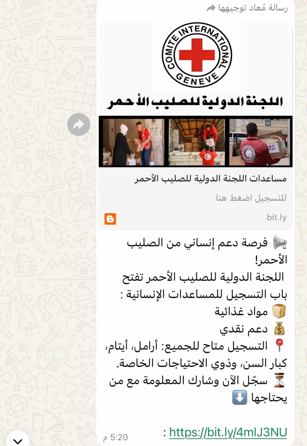 كما قام فريق المرصد بمراجعة الصفحة الرسمية للجنة الدولية للصليب الأحمر في “فيسبوك”، ولم يجد أي إعلان رسمي يتضمن رابط التسجيل للحصول على مساعدات إنسانية.