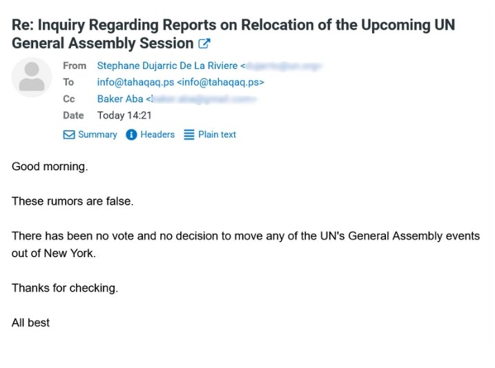 وقد نفى الناطق الرسمي باسم الأمين العام للأمم المتحدة، ستيفان دوجاريك، بشكل قاطع لـ”تحقّق”، صحة هذه المزاعم، موضحًا: “لم يتم أي تصويت، ولم يُتخذ أي قرار بنقل أي من فعاليات الجمعية العامة من نيويورك”.