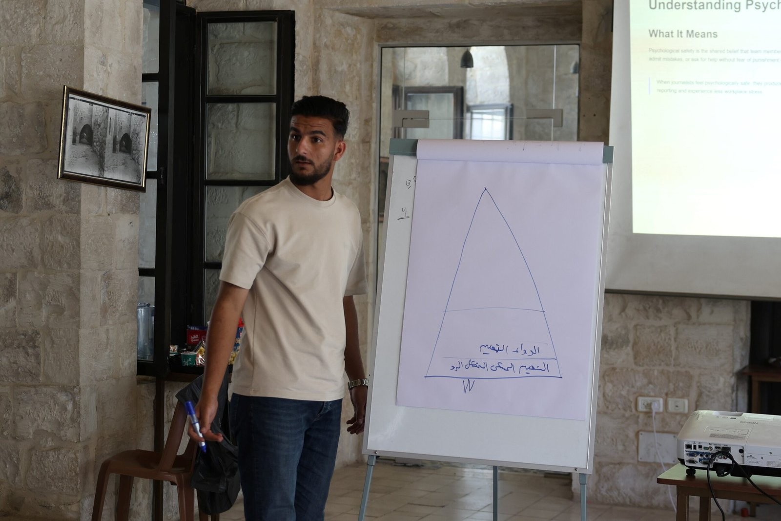 وشمل اليوم الأول من التدريب، الذي قدمه الدكتور معمر البوريني، المختص في علم النفس السريري ومدير المشاريع في مؤسسة “دراية”، مقدمة في مفاهيم الصحة النفسية وأهمية السلامة النفسية للصحفيين العاملين في الميدان.