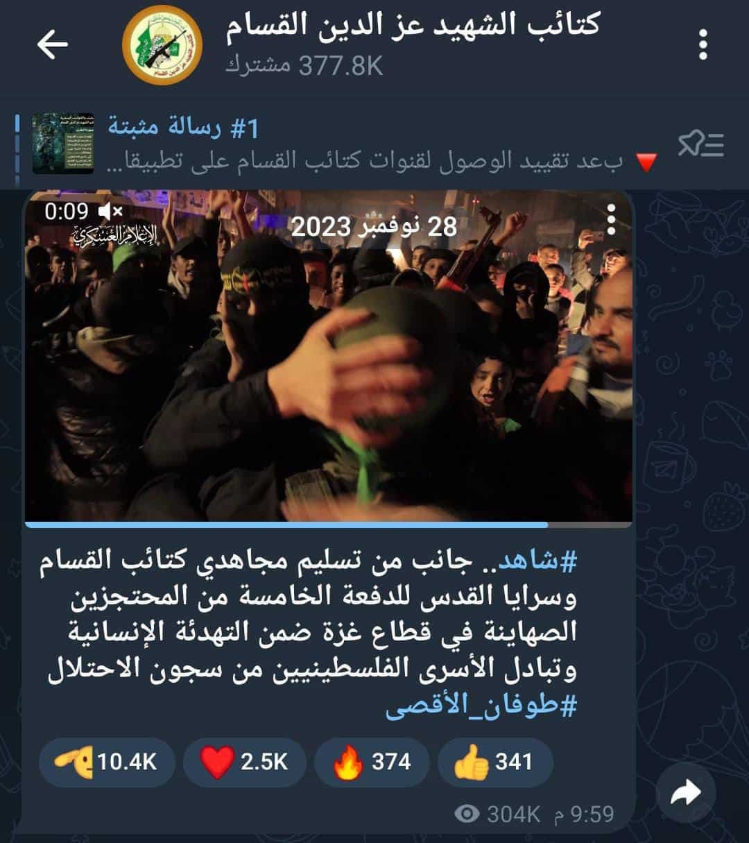 النشر السابق للفيديو عبر قناة كتائب القسام الرسمية تيليجرام بتاريخ  28 تشرين الثاني/نوڤمبر 2023.