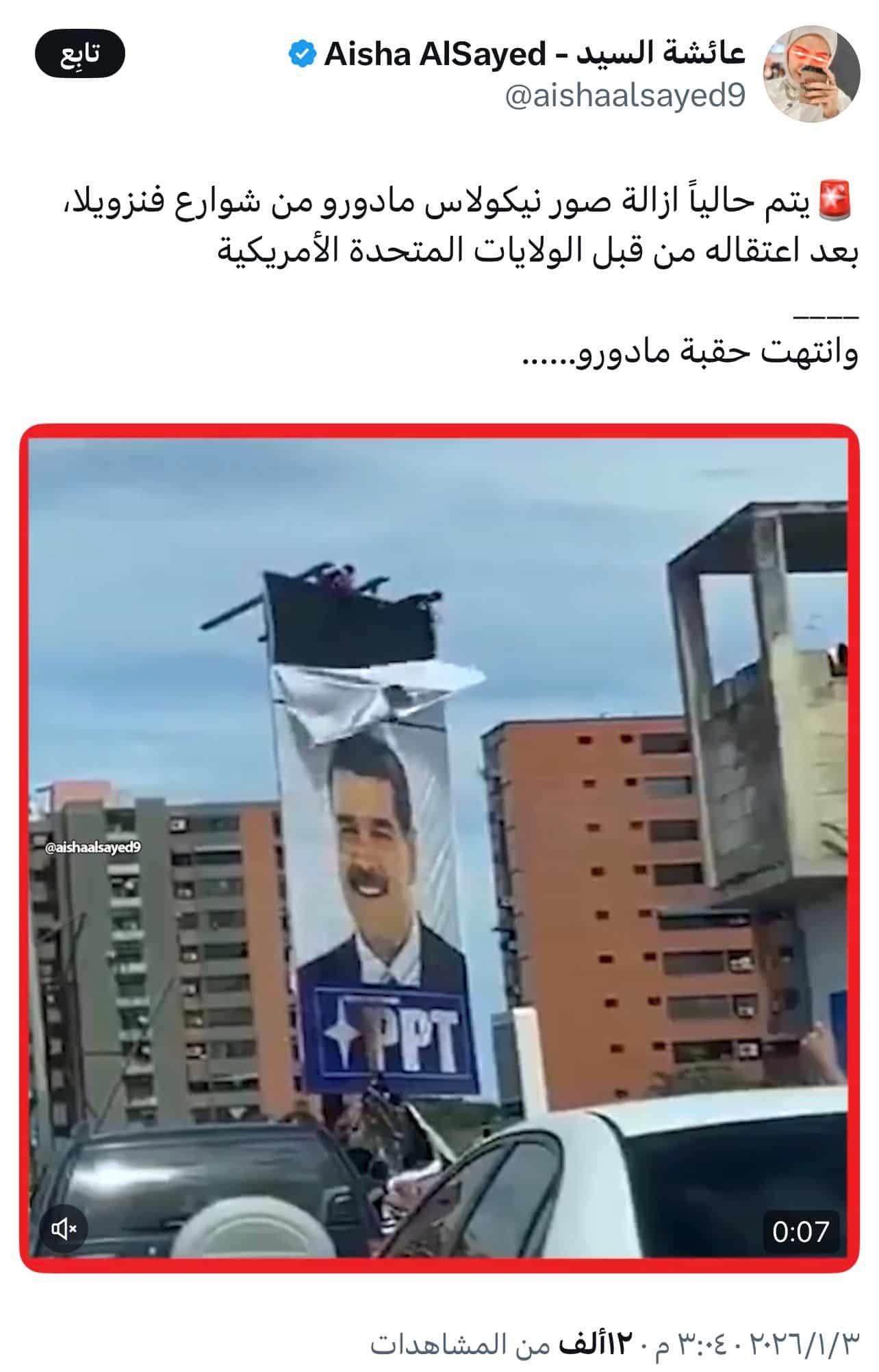 تداولت صفحات إخبارية واجتماعية على منصات التواصل الاجتماعي مقطع فيديو، قالوا إنه لإزالة صور الرئيس الفنزويلي نيكولاس مادورو من الشوارع، عقب اعتقاله من قبل الولايات المتحدة الأمريكية.