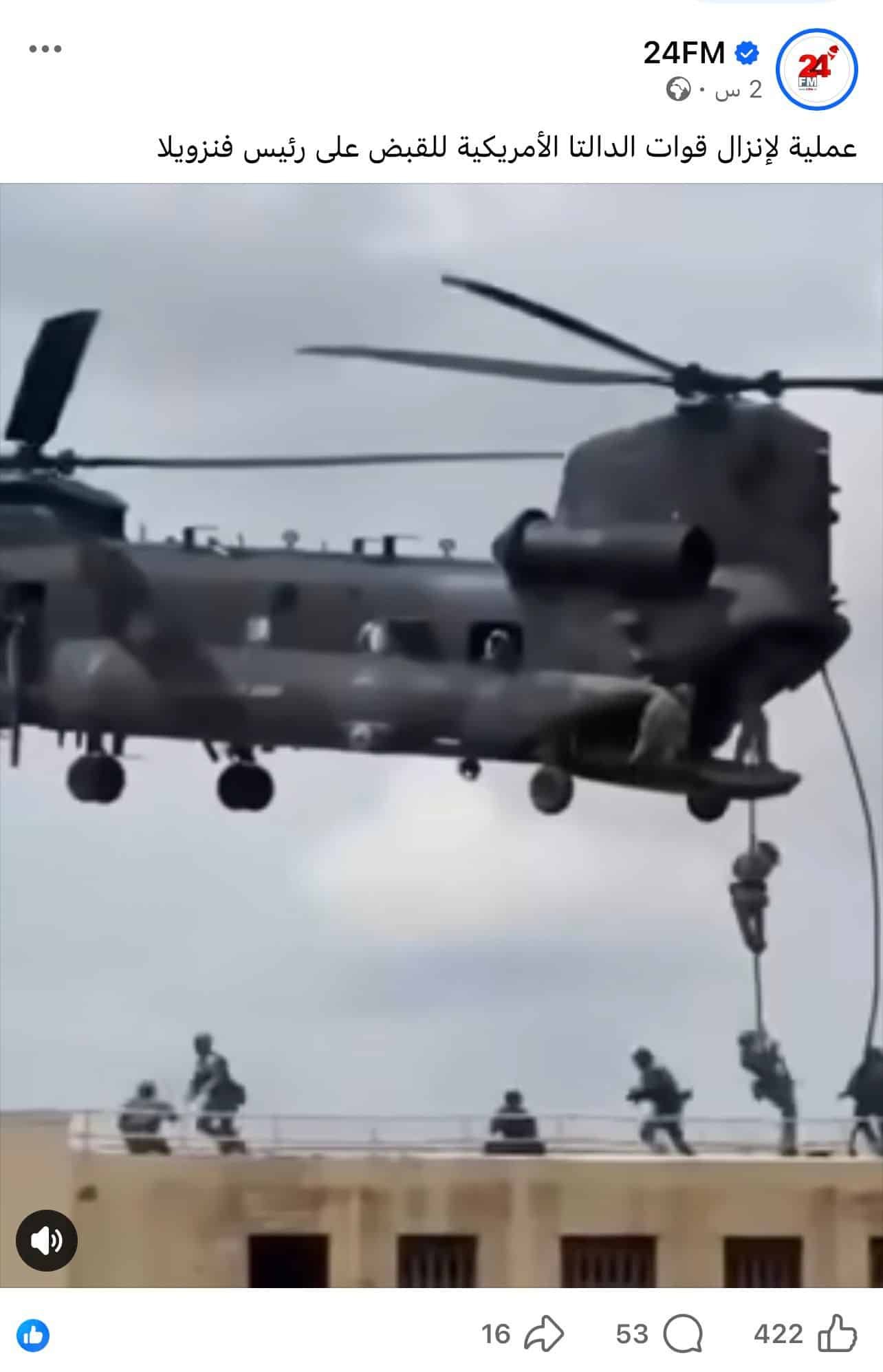 نشرت صفحات إخبارية واجتماعية عبر منصات التواصل الاجتماعي مقطع فيديو، قالوا إنه يوثّق “عملية إنزال قوات دلتا الأمريكية للقبض على رئيس فنزويلا”.