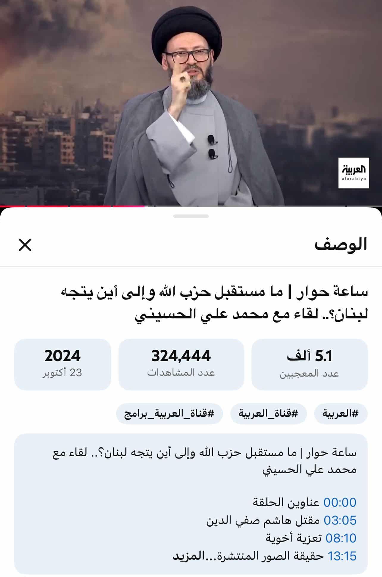 | النشر السابق للفيديو عبر قناة “العربية” على منصة يوتيوب بتاريخ 23 تشرين الأول/أكتوبر 2024. |