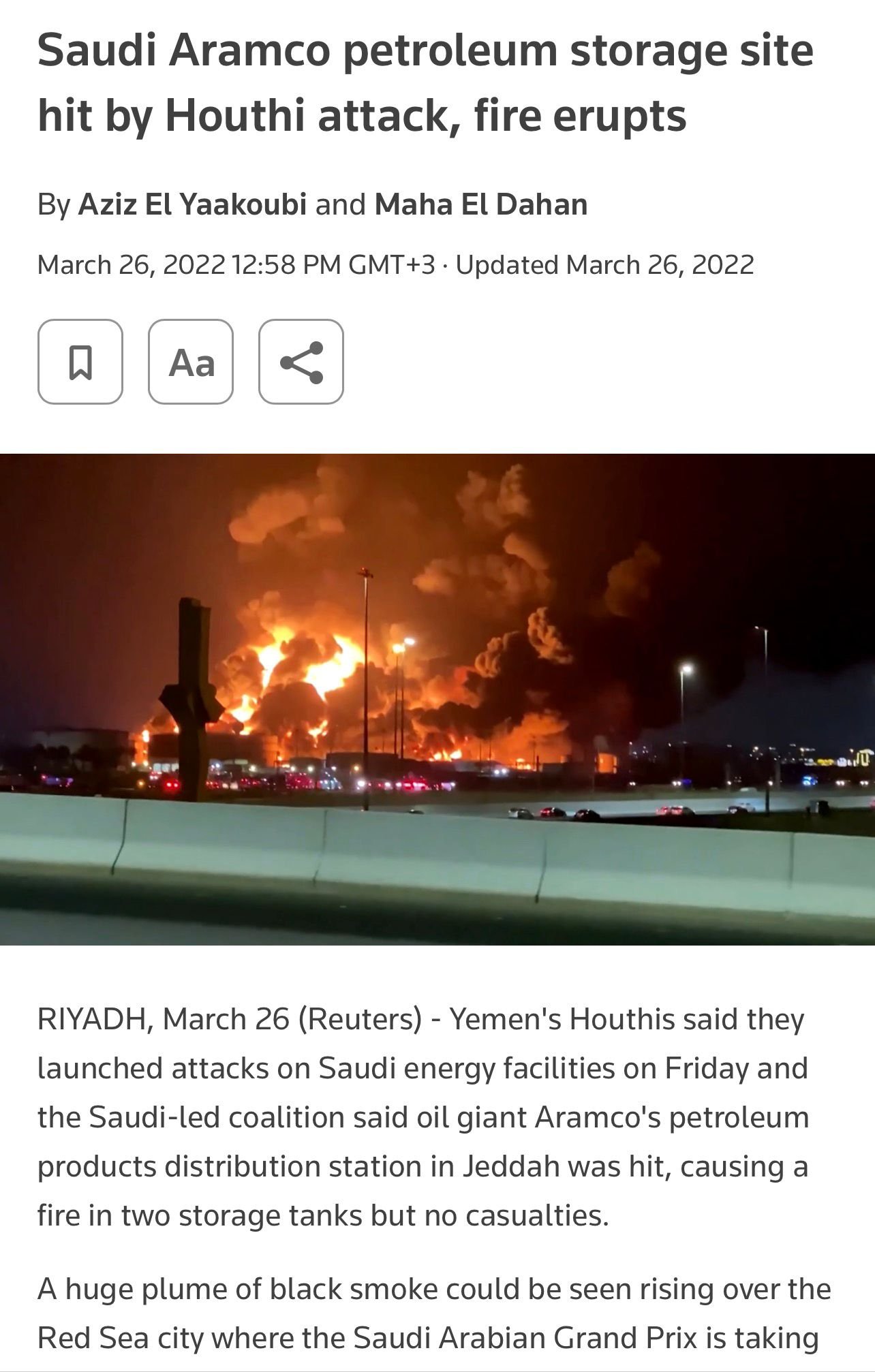 ويُذكر أن جماعة “أنصار الله الحوثي” أعلنت في ذلك الوقت مسؤوليتها عن هجمات استهدفت منشآت طاقة سعودية، حيث تعرّضت محطة تابعة لأرامكو في مدينة جدة لهجوم أدى إلى اندلاع حريق في خزانين نفطيين دون تسجيل إصابات. وقد شوهد دخان أسود كثيف يتصاعد فوق المدينة بالتزامن مع إقامة سباق “الفورمولا 1”.