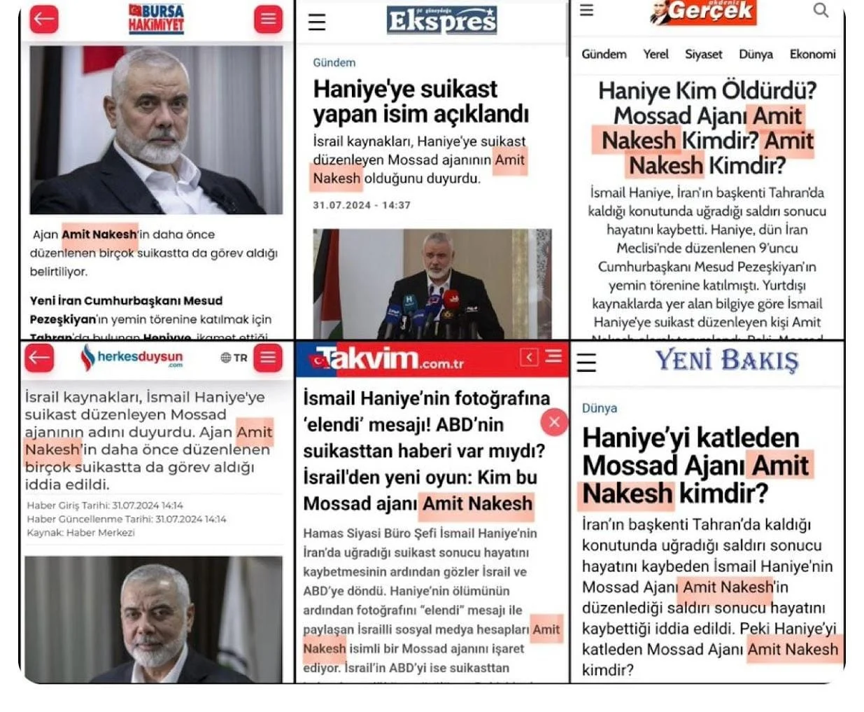Since 31 July 2024, Turkish media outlets have been buzzing with the name “Amit Nakesh,” claiming that he is the person responsible for the assassination of Hamas political bureau chief Ismail Haniyeh, and that he is an experienced agent in the Israeli secret intelligence agency “Mossad,” who served as an officer in a secret intelligence unit of the Israeli occupation army, and later joined Mossad and participated in high-level operations. They added that he specializes in assassinations and intelligence operations, and played decisive roles in various operations against targets that the occupation state considers enemies, and attributed this information to Hebrew and foreign sources.