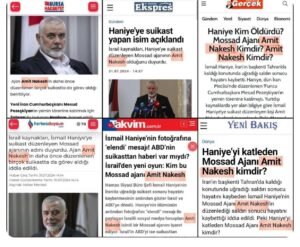 The same account later shared a screenshot of the Turkish news sites that had reported the story and commented sarcastically, saying: “Turkish newspapers are extensively reviewing the disclosure of the name of the Mossad agent who killed Haniyeh, Colonel Amit Nakish. It started with this post yesterday on Twitter, and it turned out that many Turkish journalists are following me.”