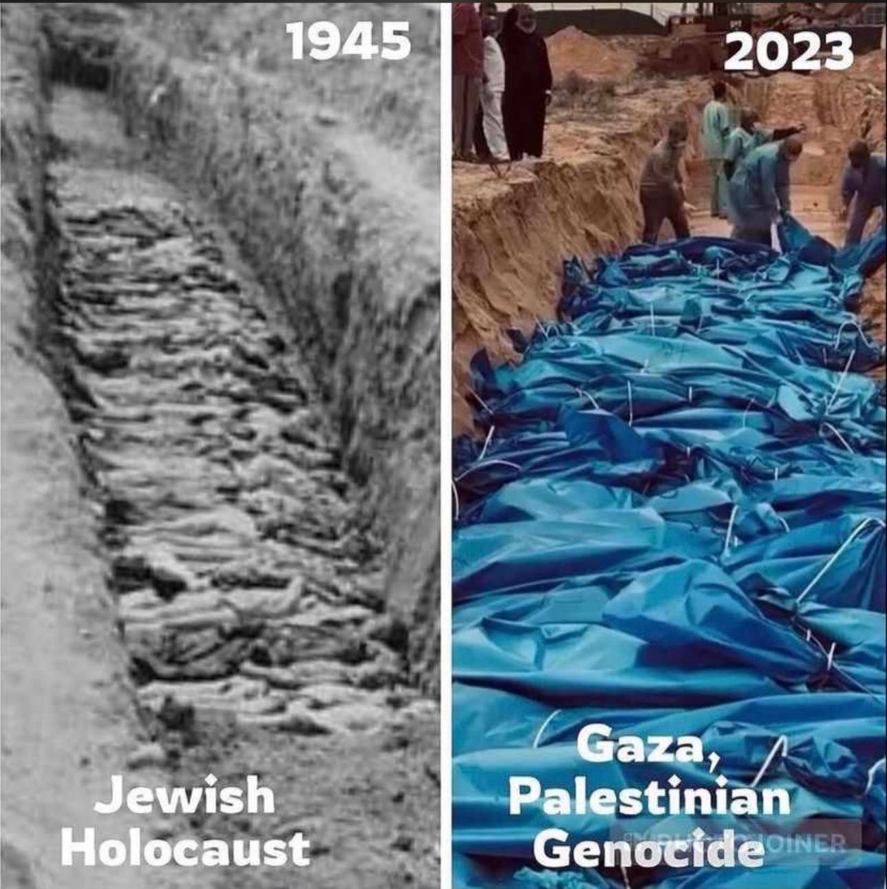 The first, in color, documents the burial of several bodies in a mass grave, while the second, in black and white, shows an image of a mass grave labeled “Jewish Holocaust.” They claim that the colored image is from Africa in 1945, suggesting the falsity of the Palestinian narrative.