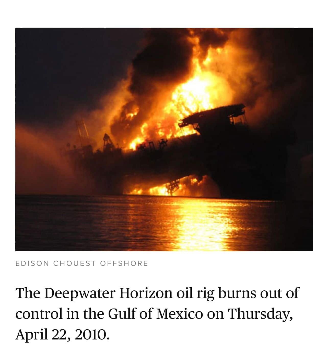 وثّق عدد من المواقع الإخبارية حادثة احتراق منصة النفط “ديب ووتر هورايزون” في خليج المكسيك بالقرب من الولايات المتحدة الأمريكية إثر تسرب نفطي، بتاريخ 22 إبريل/نيسان 2010.