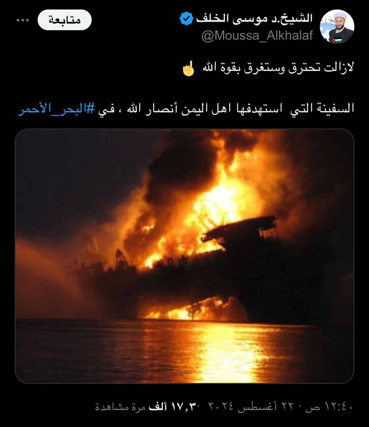 تداولت صفحات وحسابات -على موقع التواصل الاجتماعي إكس- صورة قالوا إنها لاحتراق سفينة استهدفها الحوثيون في البحر الأحمر، أمس الأربعاء الـ21 أغسطس/آب الجاري.