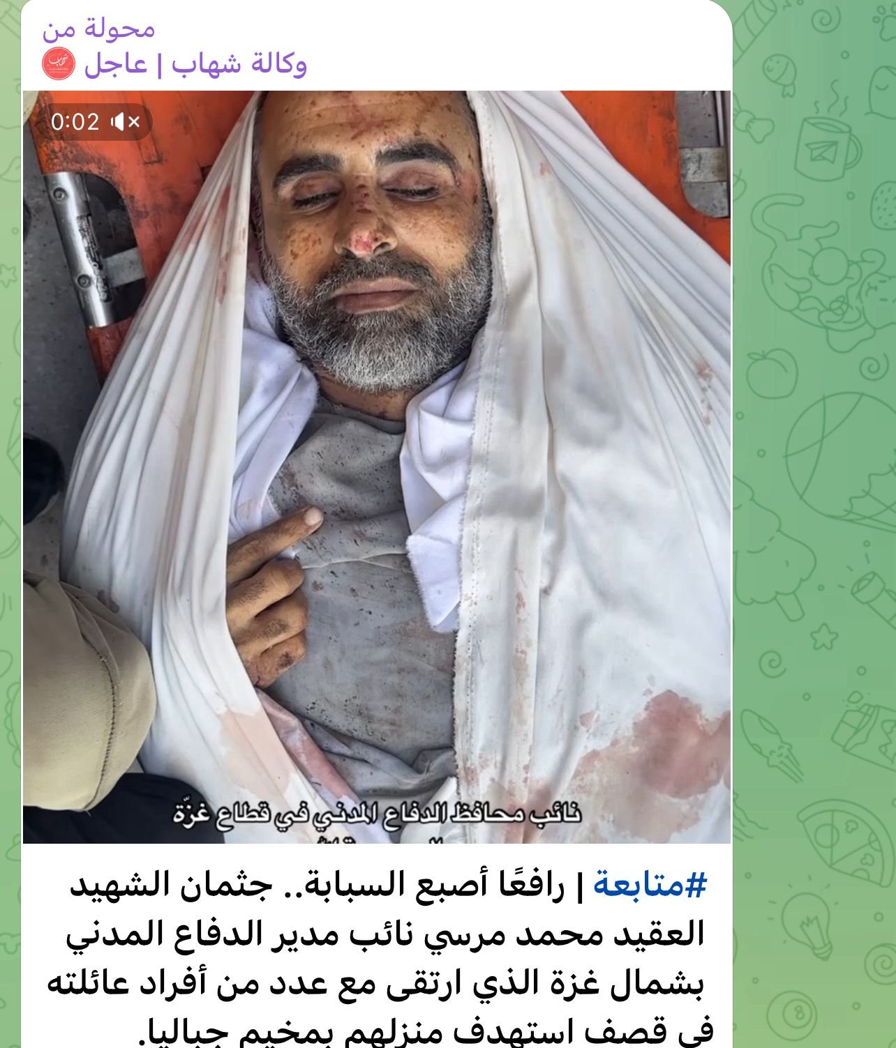تعود الصورة المتداولة إلى جثمان الشهيد العقيد محمد مرسي نائب مدير الدفاع المدني في شمال قطاع غزة، والذي ارتقى برفقة عدد من أفراد عائلته إثر قصف منزله فجر اليوم الأحد بمخيم جباليا شمالي القطاع.