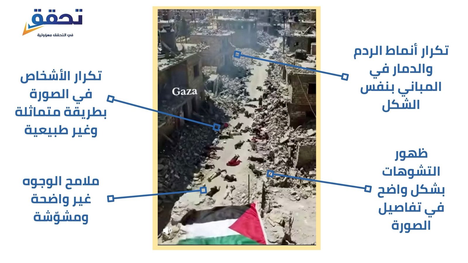 وعند تحليل الصورة من قبل الفريق التقني في مرصد “تحقّق”، توصّل الفريق إلى عدد من المؤشرات الواضحة التي تدل على أن الصورة مُنتجة باستخدام تقنيات الذكاء الاصطناعي، ومن أبرز هذه المؤشرات: