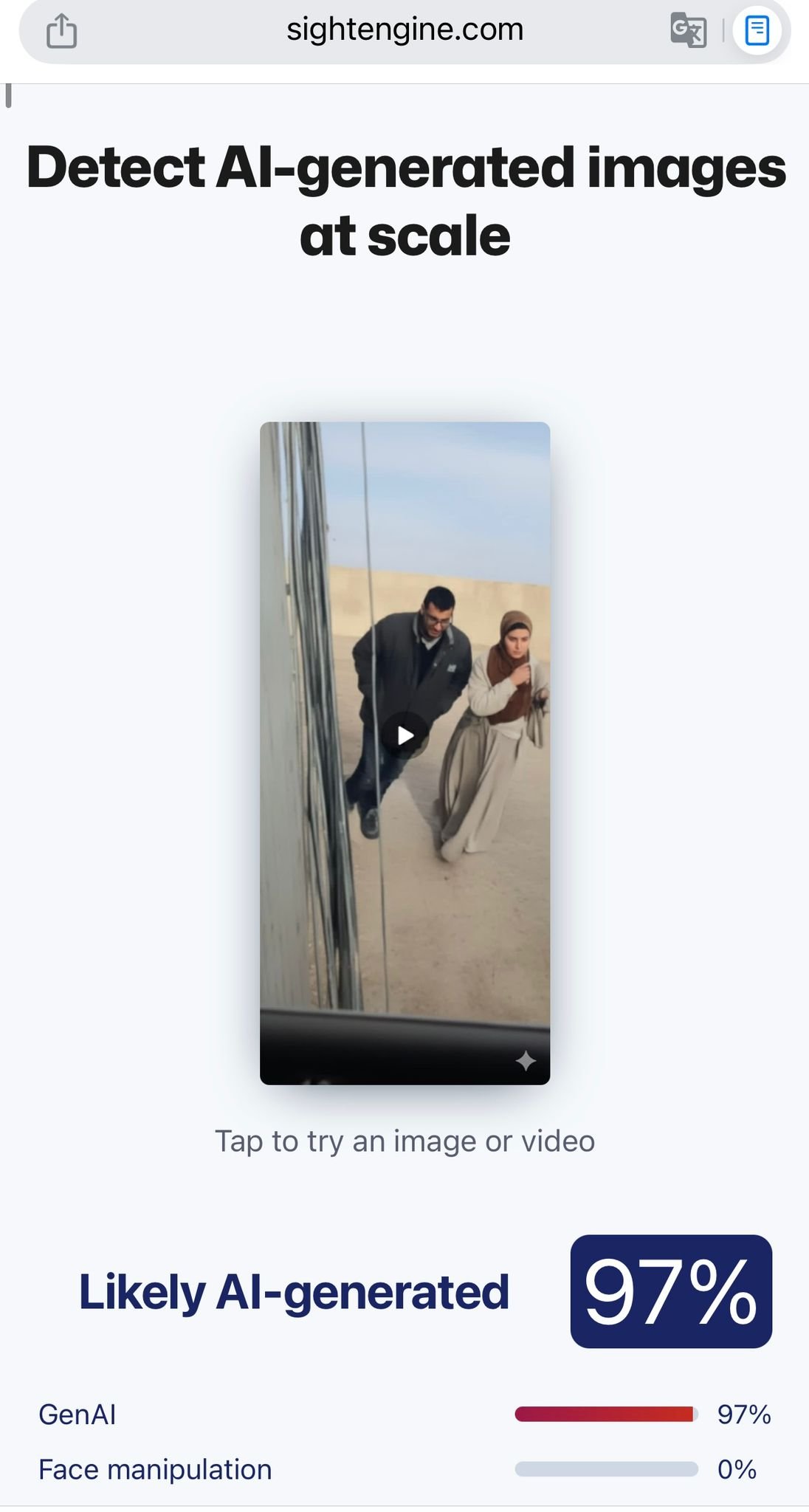 وقد أظهر فحص الصورة عبر أداة Sightengine المتخصصة في كشف المحتوى المولّد رقمياً أن الصورة تم توليدها بالذكاء الاصطناعي بنسبة عالية بلغت 97% ما يشير إلى عدم صحتها