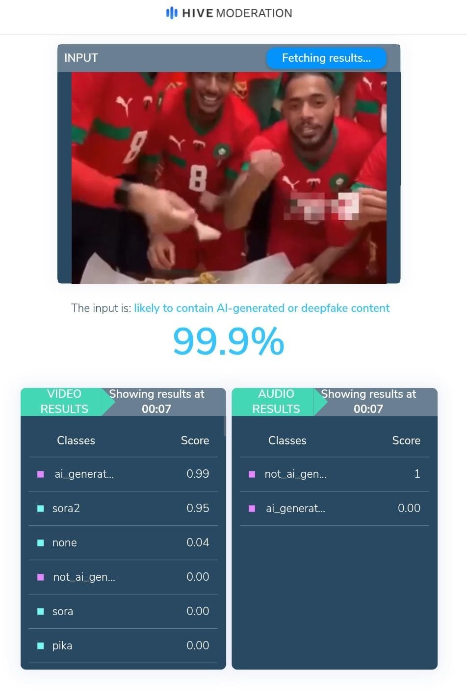 وبعد فحص مقطع الفيديو رقمياً باستخدام أداة “HIVE MODERATION” المخصصة لاكتشاف المحتوى المولَّد بالذكاء الاصطناعي، تبيّن أن المقطع قد تم إنشاؤه بواسطة هذه التقنيات، حيث أكدت الأداة ذلك بنسبة بلغت 99.9%.