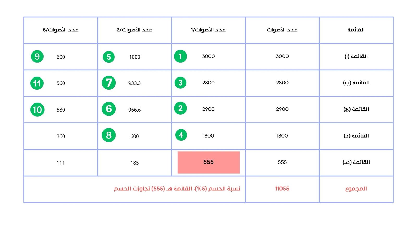 - القائمة (هـ): 555 صوت (تجاوزت نسبة الحسم)