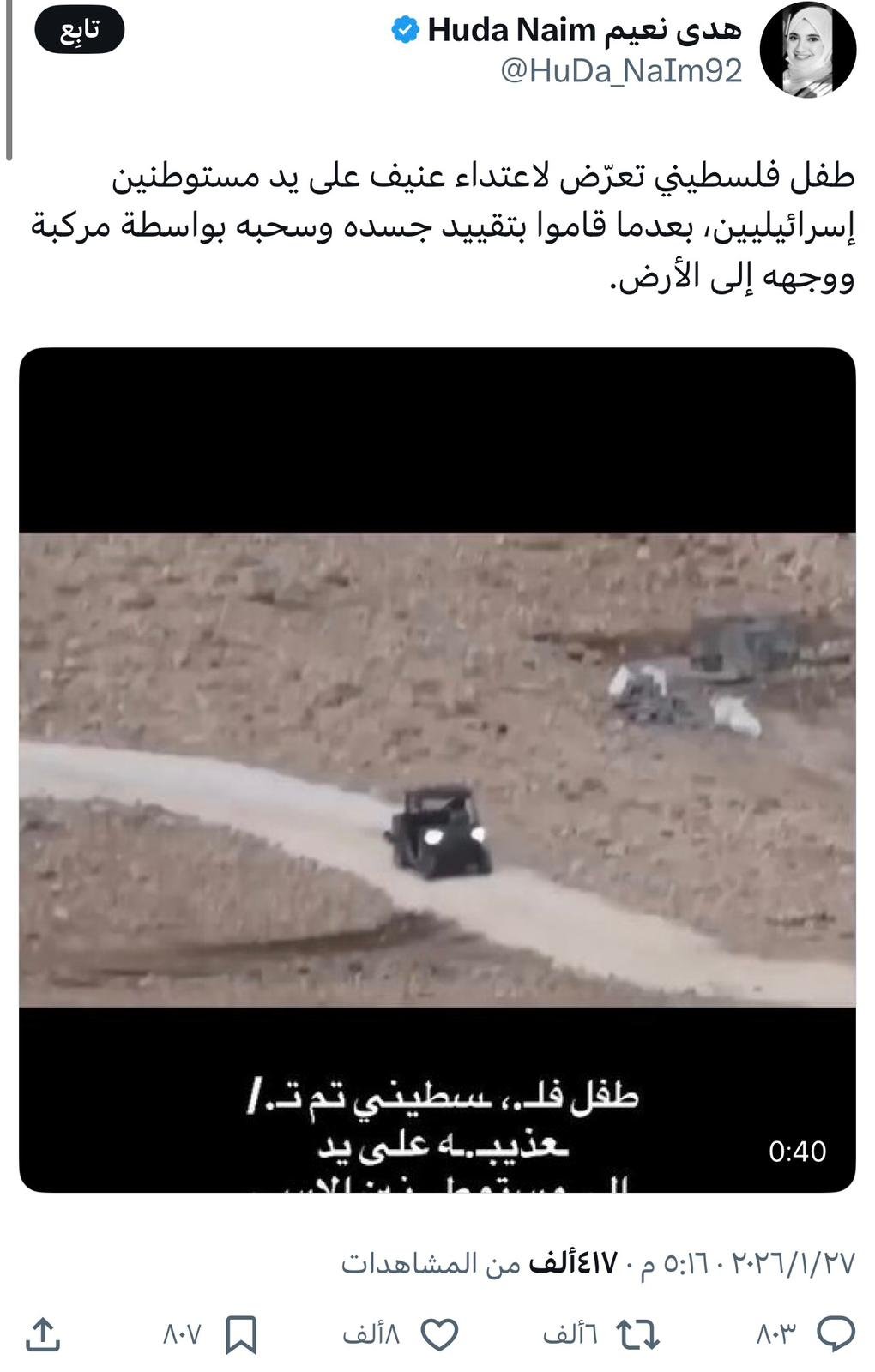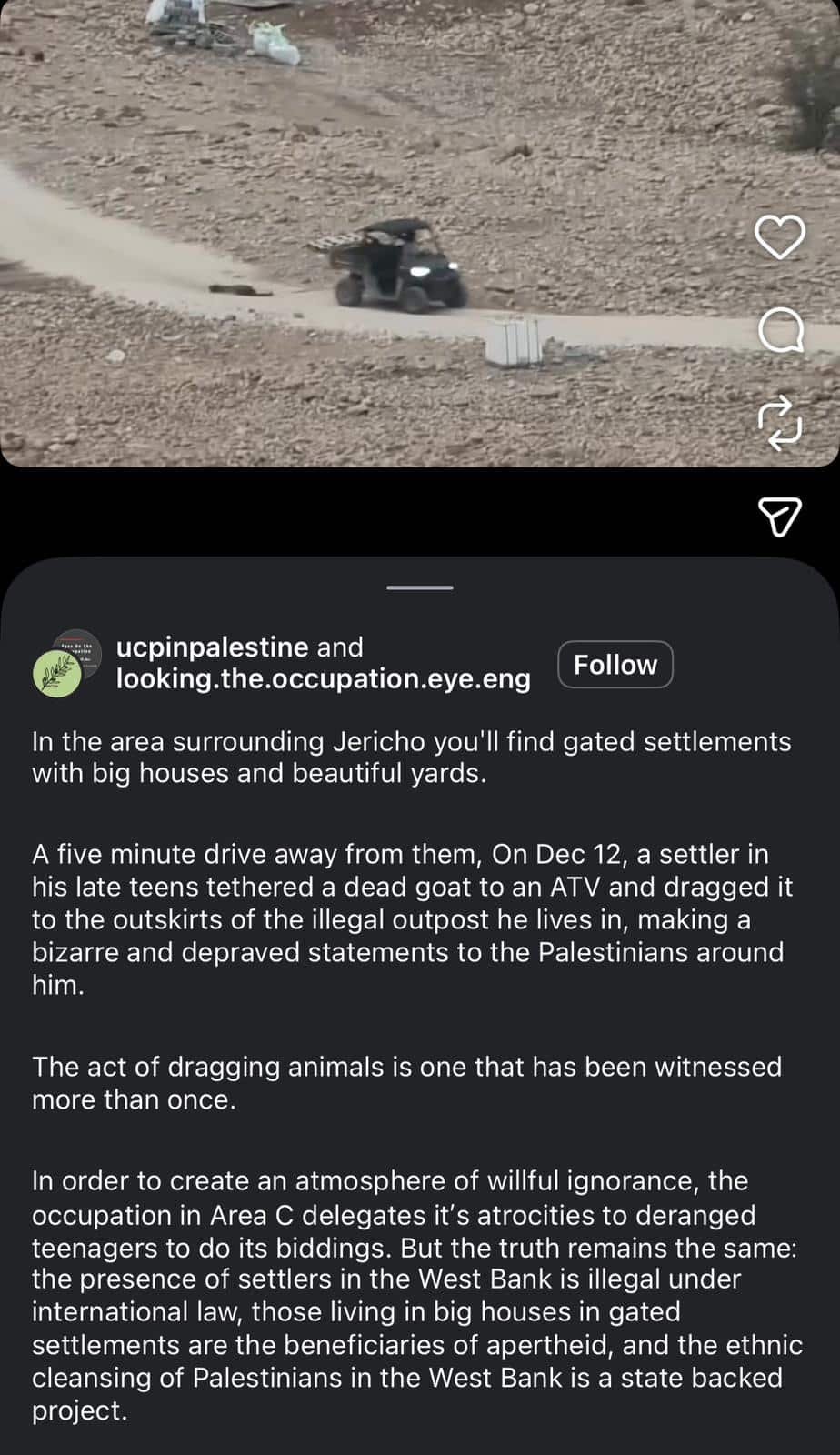 وأفاد الحساب أن الفيديو يوثق حادثة وقعت في 12 ديسمبر/كانون الأول 2025، في تجمع بدوي فلسطيني قرب مدينة أريحا، حيث أقدم مستوطن على ربط عنزة نافقة بدراجة رباعية الدفع وسحبها باتجاه محيط بؤرة استيطانية غير قانونية يقيم فيها، مطلقًا خلال ذلك تصريحات مسيئة بحق الفلسطينيين المتواجدين في المنطقة.