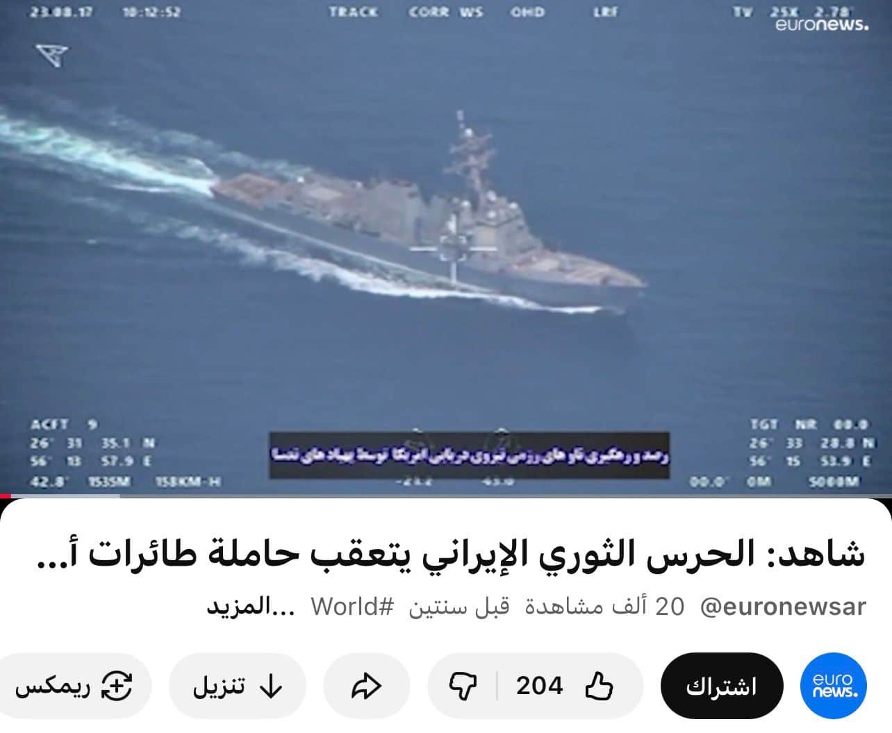 إذ نُشر المقطع الأول عبر قناة “يورونيوز عربي” على يوتيوب بتاريخ 20 آب/أغسطس 2023، ويُظهر عملية تعقّب نفذها الحرس الثوري الإيراني لحاملة طائرات أمريكية أثناء عبورها مضيق هرمز، دون صدور أي تحذير بالانسحاب أو تهديد بالإغراق.