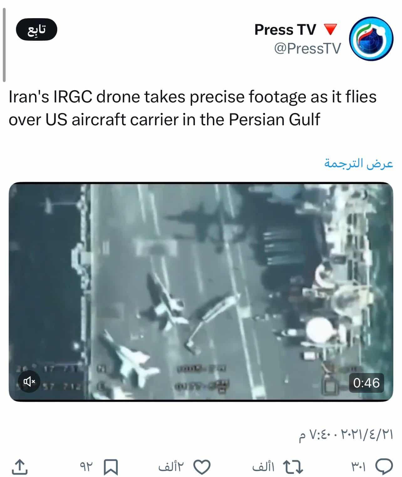 أما المقطع الثاني فقد نُشر عبر حساب “Press TV” على منصة إكس بتاريخ 22 نيسان/أبريل 2021، ويعود إلى لقطات مصورة بطائرة مسيّرة لحاملة طائرات أمريكية، دون علاقة بالأحداث الحالية.
