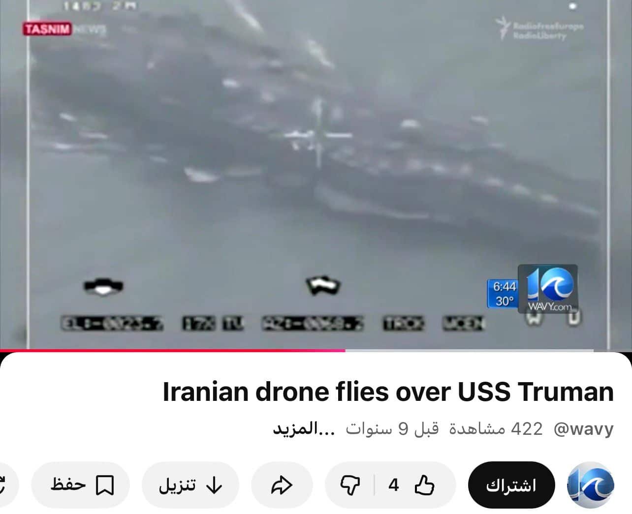أما الصورة، فاتضح أنها مقتطعة من مقطع فيديو نُشر سابقًا عبر قناة “WAVY TV” على يوتيوب بتاريخ 10 شباط/فبراير 2016، وتُظهر طائرة إيرانية بدون طيار تحلق فوق حاملة الطائرات الأمريكية ترومان، وليس أبراهام لينكولن كما زُعم.
