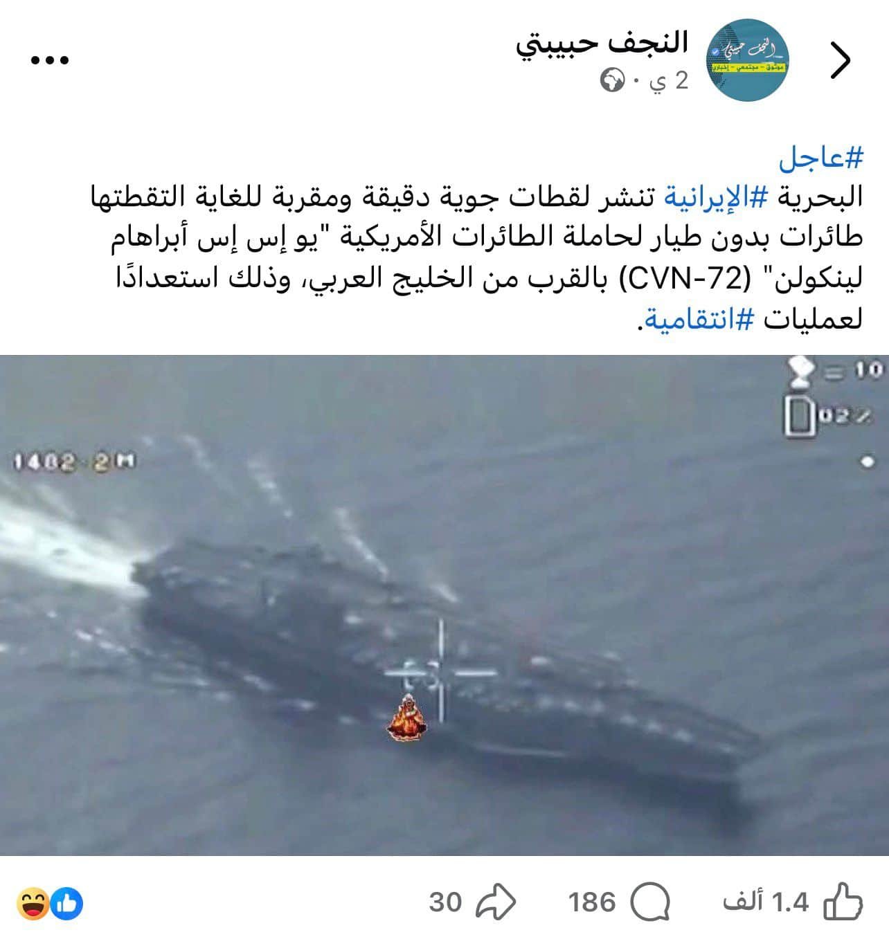 وأُرفقت أيضًا صورة بادعاء أن طائرة استطلاع إيرانية تحلق حاليًا فوق الموقع الأخير المعروف لحاملة الطائرات ذاتها.