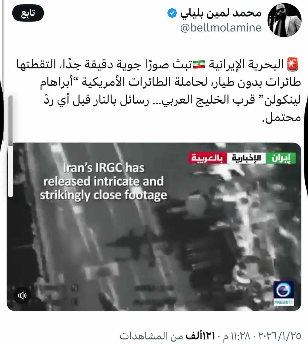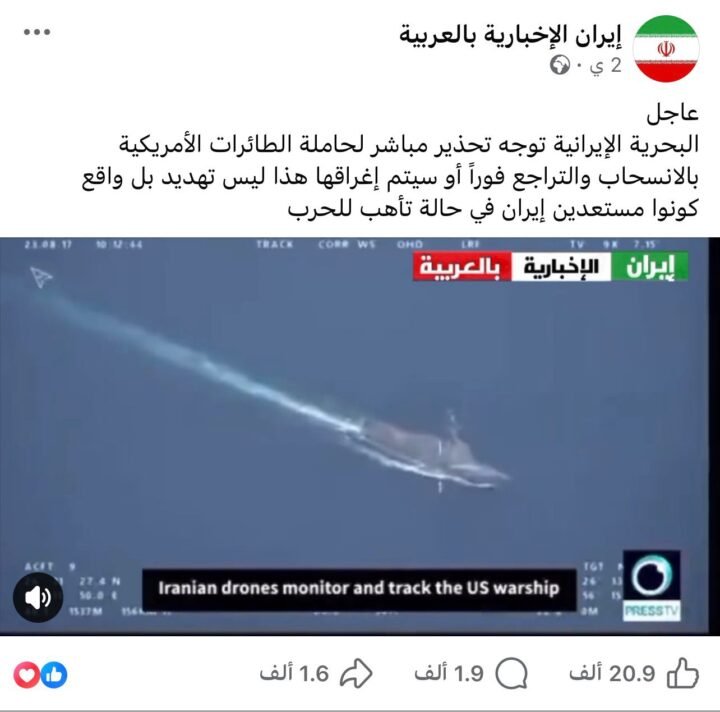 تداولت صفحات على مواقع التواصل الاجتماعي ومستخدمون مقاطع فيديو وصورة، مرفقة بادعاءات تفيد بأن البحرية الإيرانية وجّهت تحذيراً مباشراً لحاملة الطائرات الأمريكية، مطالبة إياها بالانسحاب فورًا تحت طائلة الإغراق، مع تأكيد أن إيران في حالة تأهب للحرب.