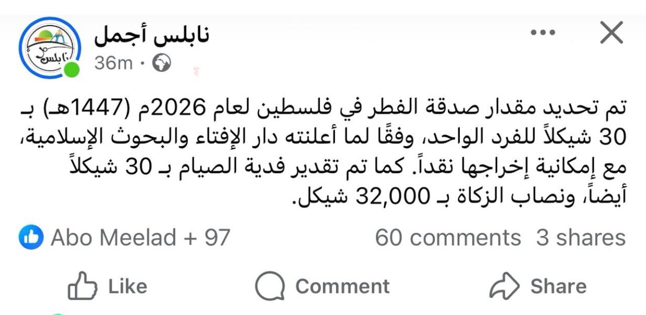| تحديد صدقة الفطر في فلسطين لعام 2026م (1447هـ) بـ 30 شيكلًا، ونصاب الزكاة بـ 32,000 شيكل. |