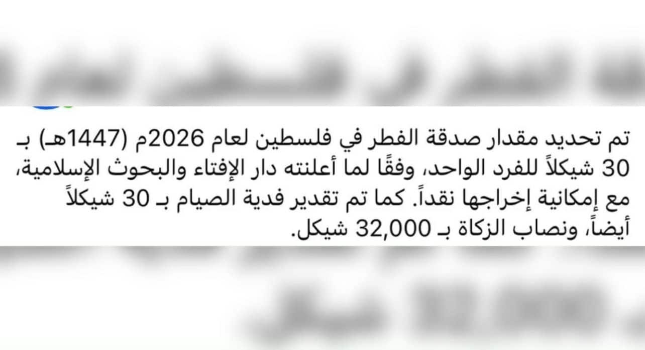 تداولت صفحات اجتماعية عبر منصات التواصل الاجتماعي خبرًا حول تحديد مقدار صدقة الفطر في فلسطين لعام 2026م (1447هـ) بمبلغ 30 شيكلًا للفرد الواحد، ونصاب الزكاة بمبلغ 32,000 شيكل، وزعمت هذه المنشورات أن القرار صادر عن دار الإفتاء والبحوث الإسلامية.