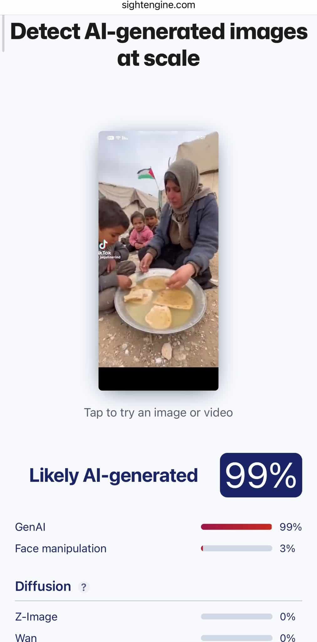 | كشف تدقيق مرصد “تحقّق” أن فيديو الأم من قطاع غزة التي تطعم أطفالها خبزًا يابسًا خلال رمضان، غير حقيقي ومُولّد بالكامل باستخدام تقنيات الذكاء الاصطناعي بنسبة 99%. |