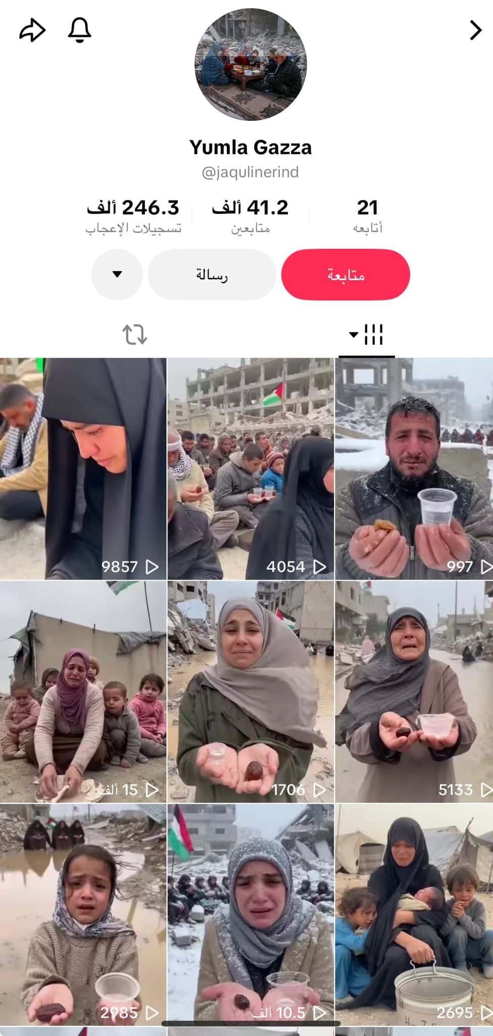 وبالعودة إلى أصل المقطع، تبين أنه نُشر سابقًا عبر حساب يحمل اسم “Yumla Gazza” بتاريخ 21 فبراير/شباط، وهو حساب يواصل نشر مقاطع مصنّعة رقميًا مع نسبها لقطاع غزة.