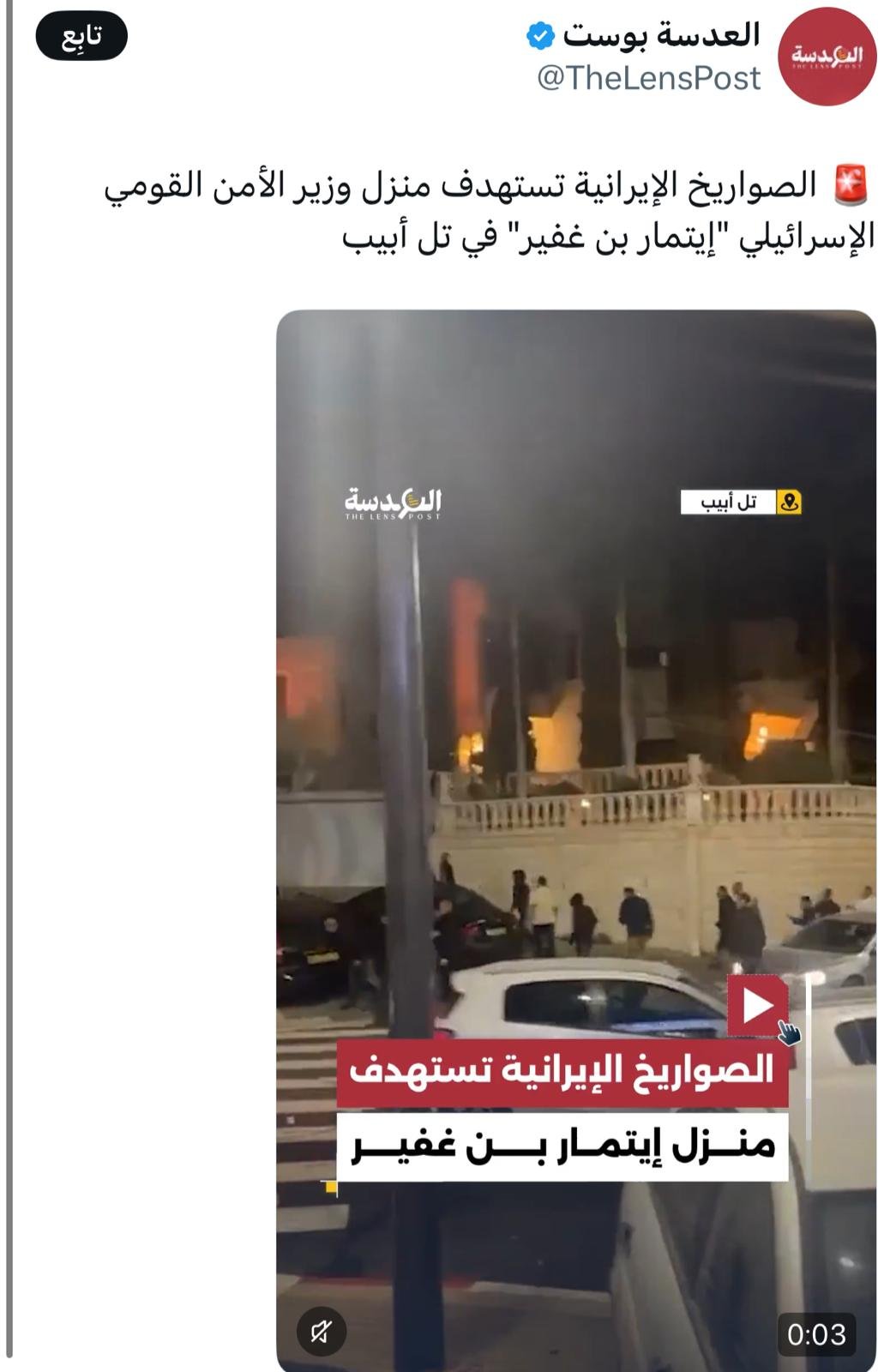 تداولت صفحات إخبارية واجتماعية وحسابات على منصات التواصل الاجتماعي مقطع فيديو مرفقًا بادعاء يفيد بأنه يوثّق استهداف منزل وزير الأمن القومي الإسرائيلي إيتمار بن غفير.