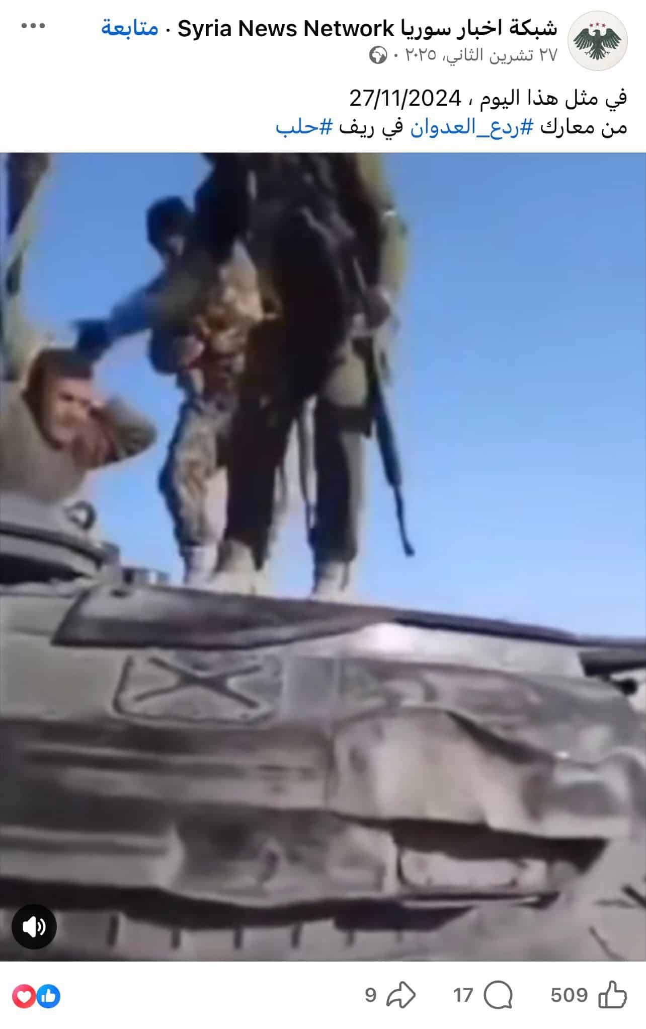 | كشف تدقيق مرصد “تحقق” أن المقطع المتداول قديم، ويعود إلى معارك “ردع العدوان” في ريف حلب بتاريخ 27 نوفمبر/تشرين الثاني 2024. وقد نُشر لاحقاً بتاريخ 27 نوفمبر/تشرين الثاني 2025، عبر صفحة “شبكة أخبار سوريا – Syria News Network” على منصة فيسبوك، ويُظهر لحظة إخراج جندي من داخل دبابة في سياق مختلف. |
