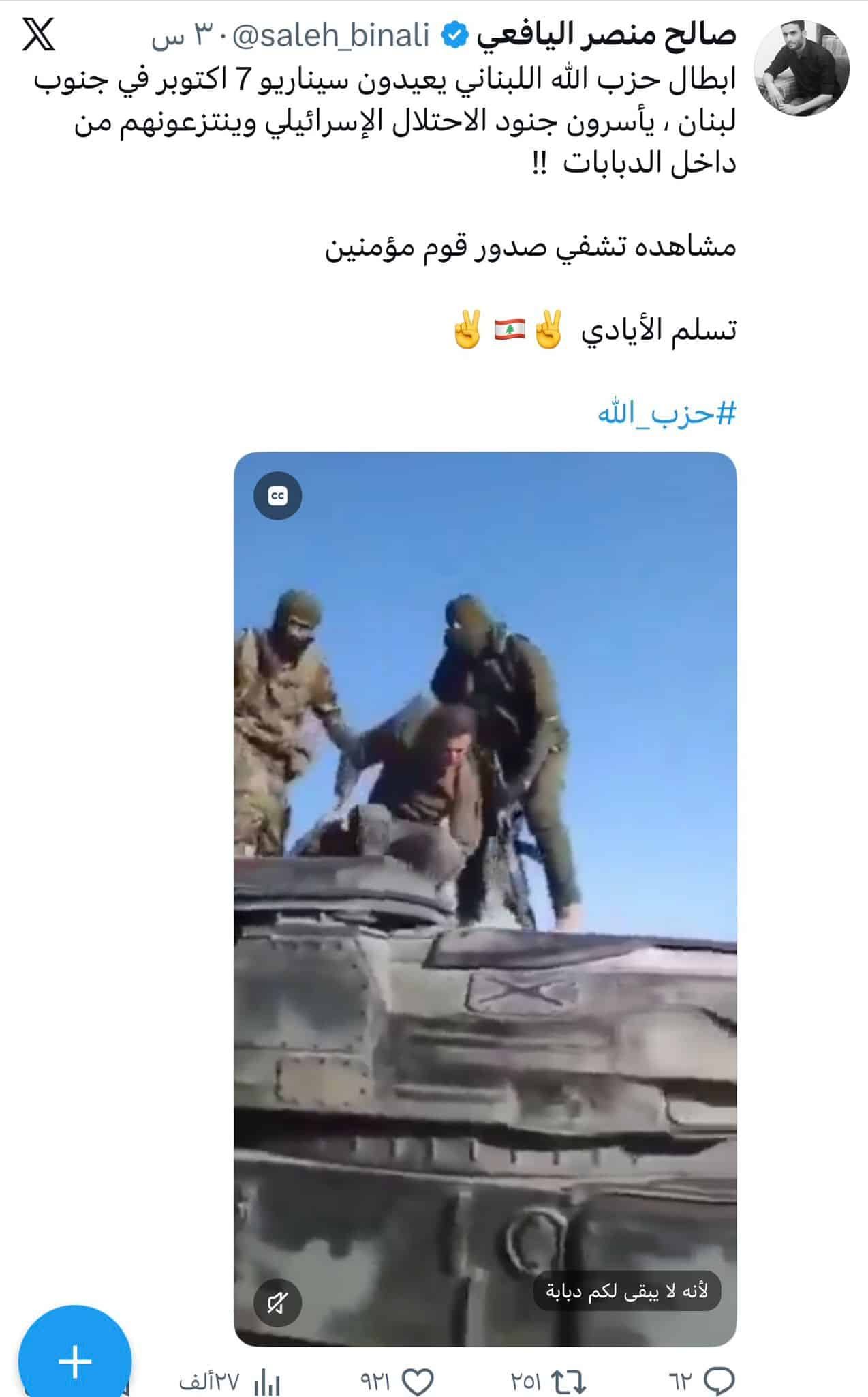 تداولت صفحات وحسابات على منصات التواصل الاجتماعي مقطع فيديو مرفقاً بادعاء مفاده أن عناصر من حزب الله نفذوا عملية شبيهة بأحداث السابع من أكتوبر، تتضمن استهداف دبابة وأسر جنود من داخلها.